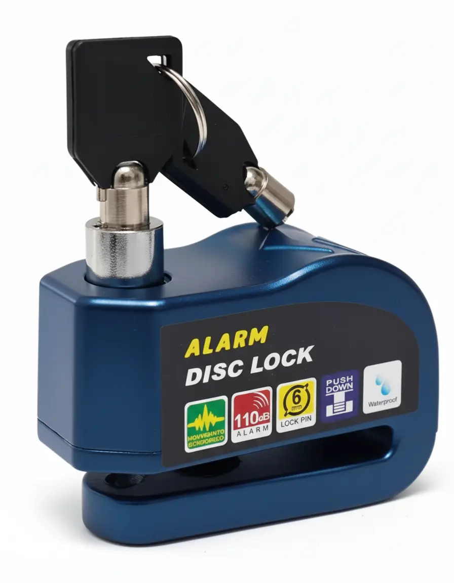 Candado para disco de moto con alarma opcional activable. Incluye llaves de seguridad y pilas de repuesto. Protege tu moto con practicidad y confianza.