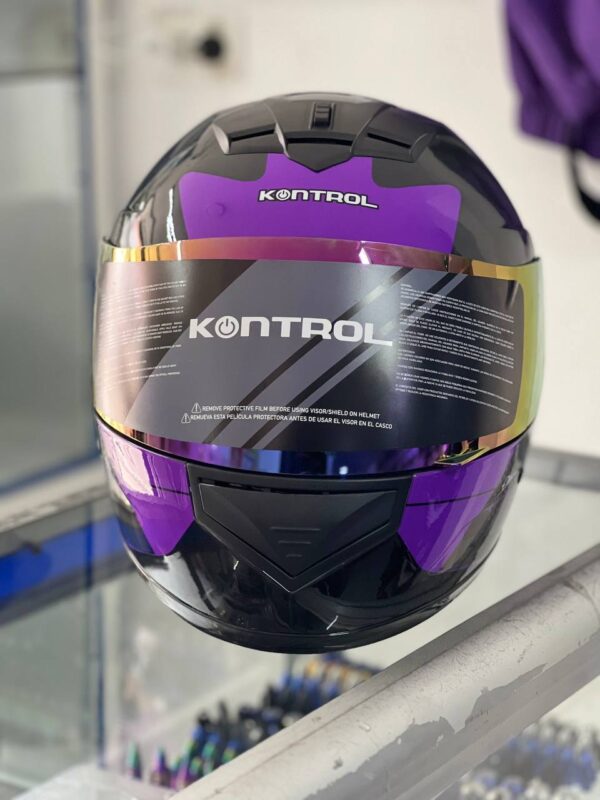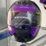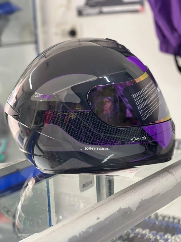 Lo primero que llama la atención del casco Kontrol Ortex es su impresionante apartado visual. Este modelo incorpora texturas que simulan la fibra de carbono en los laterales, aportando una apariencia técnica y premium. Los acentos en color morado vibrante y gris sobre la base negra le otorgan una personalidad única que destaca en el asfalto. El casco Kontrol Ortex es ideal para el piloto que no quiere pasar desapercibido, combinando perfectamente con motocicletas de corte deportivo o urbano moderno.